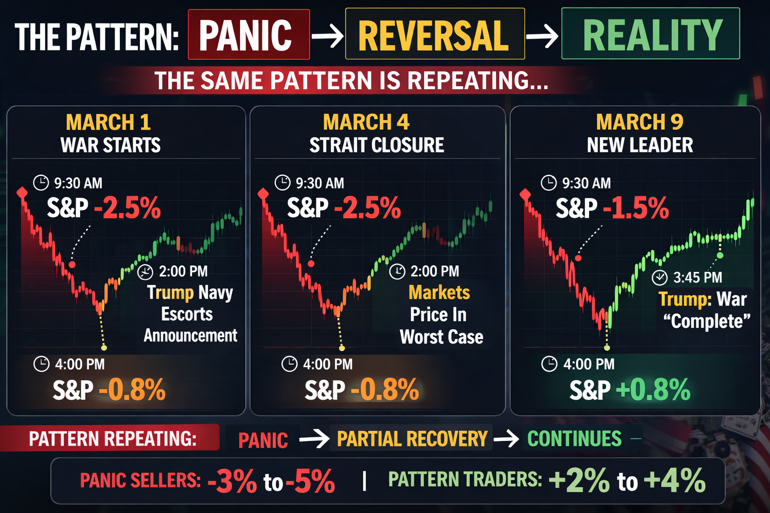 - Day 1: War escalation → Panic selling → Markets down 2-3%