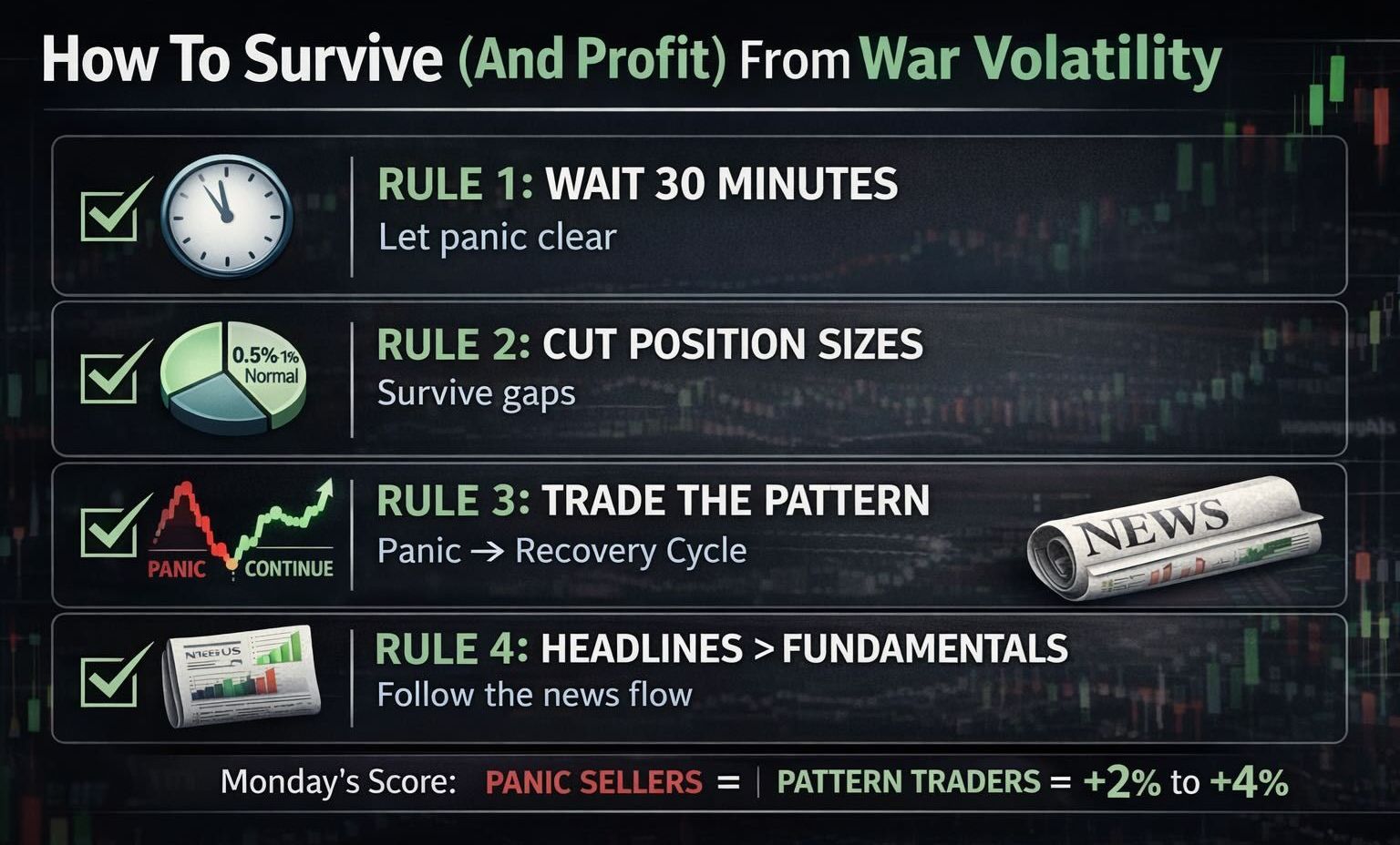 Monday taught a brutal lesson: In war-driven markets, the first move is almost always wrong. The traders who panicked and sold at the open locked in massive losses. The traders who waited, sized positions carefully, and traded the pattern instead of the headlines made money.