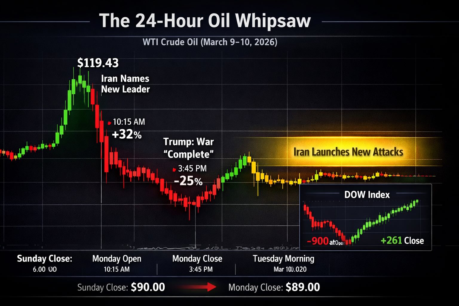 By Tuesday morning, oil was back around $90 and markets traded flat. Nobody knew whether to believe Trump’s “war complete” comment or Iran’s actions.