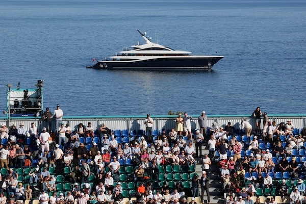 Audience members attend the Monte Carlo ATP Masters Series Tournament at the Monte-Carlo Country Club as a 79.9-metre Feadship superyacht ‘Faith’ owned by Canadian businessman Lawrence Stroll, majority shareholder of British luxury carmaker Aston Martin, is seen in the background, off the coast of Roquebrune-Cap-Martin, south-eastern on April 8, 2026. (Valery Hache/AFP via Getty Images)