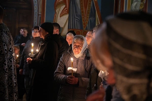 Worshippers attend Holy Thursday service inside St. Michael’s Cathedral in Kyiv, Ukraine, on April 9, 2026. (Antonis Zouridakis/Hans Lucas/AFP via Getty Images)