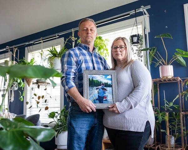 Brad and Kari Boettler hold a photo of their late son, Evan, in their home in Aurora, Mo., on March 23, 2026. (John Fredricks/The Epoch Times)