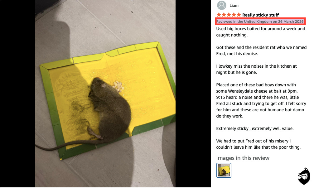 This is prolonged, preventable cruelty and these products continue to be sold through Amazon UK. The evidence is not hidden. It is on their own website. There are recent posts, including from late March 2026, showing live rats and mice stuck on glue traps sold through Amazon UK. And it does not stop there.