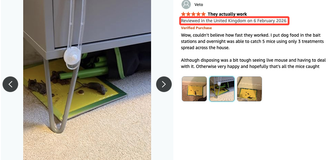 Screenshot showing someone using glue traps bought from Amazon Uk to catch and kill mice, February 6th 2026.