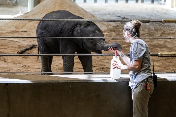Linh Mai, a 2-month-old Asian elephant, is fed a bottle of formula in her enclosure during a media preview event at the Smithsonian National Zoological Park in Washington on April 14, 2026. The new elephant was born Feb. 2 and is the first Asian elephant born at the zoo in 25 years. (Anna Moneymaker/Getty Images)
