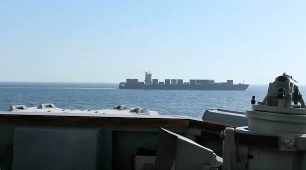 The Iranian-flagged vessel Touska seen from a distance on April 19, 2026. (U.S. Central Command/Screenshot via The Epoch Times)